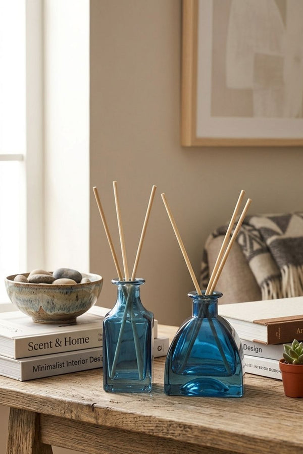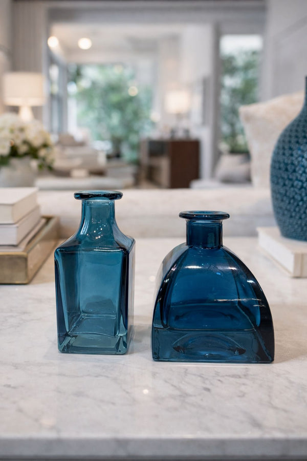 O conjunto apresenta uma composição sofisticada que une formas distintas em perfeita harmonia, criando um diálogo visual entre linhas retas e curvas suaves. Produzidos em vidro de acabamento refinado, os dois frascos revelam transparência, profundidade e reflexos que se transformam conforme a luz incide sobre a peça, elevando a percepção de elegância no ambiente.