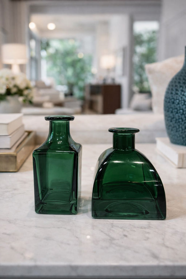 O conjunto apresenta uma composição sofisticada que une formas distintas em perfeita harmonia, criando um diálogo visual entre linhas retas e curvas suaves. Produzidos em vidro de acabamento refinado, os dois frascos revelam transparência, profundidade e reflexos que se transformam conforme a luz incide sobre a peça, elevando a percepção de elegância no ambiente.