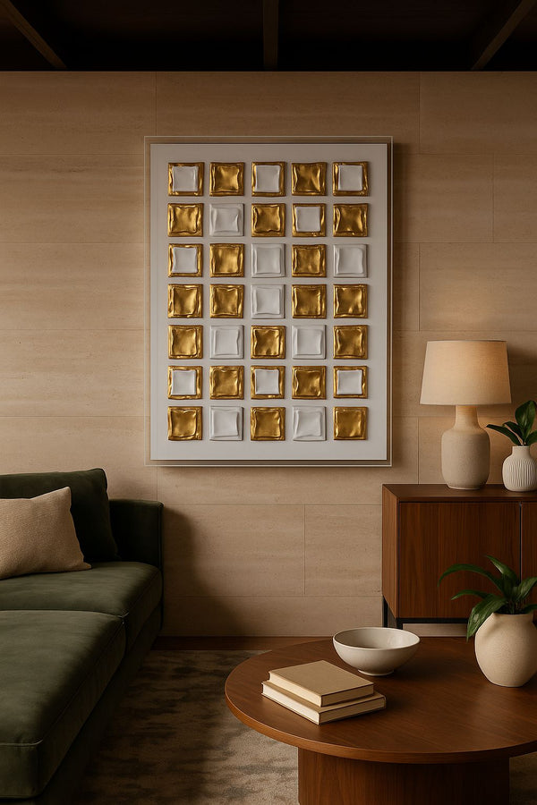Com dimensões imponentes de 100cm x 75cm, o Harmonia D’Oro é uma obra que transcende a função decorativa para assumir o papel de verdadeiro protagonista em qualquer ambiente. Cada módulo em dourado e branco, cuidadosamente disposto em um mosaico tridimensional, cria uma dança sutil entre luz e sombra, refletindo sofisticação e imponência.