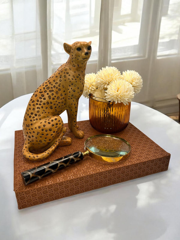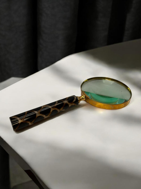 Descubra os detalhes que passam despercebidos com a sofisticada Lupa "Olho de Marfim" — uma peça que une elegância vintage e funcionalidade. Seu cabo artesanal em madeira com acabamento de padrão animal print oferece um toque exótico e contemporâneo, enquanto a borda da lente em metal dourado envelhecido traz charme e personalidade à peça.