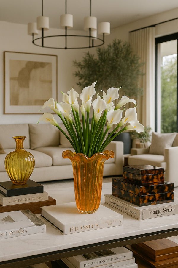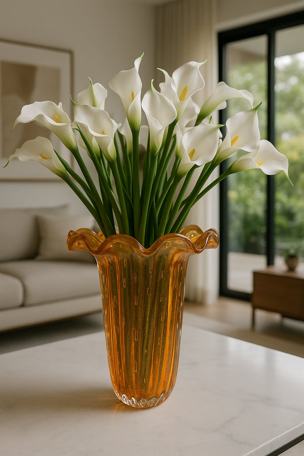 Com suas linhas fluidas e o brilho intenso do vidro artesanal, o Vaso Murano Aureo di Luce é uma peça que transcende o conceito de decoração para se tornar um verdadeiro ícone de sofisticação. Seu tom âmbar profundo, enriquecido com delicadas partículas de pó de ouro, reflete a luz com um esplendor único, criando um jogo de brilhos que enche o ambiente de calor e requinte. Com 40 cm de diâmetro por 40 cm de altura, é imponente e versátil, ideal para composições luxuosas em aparadores, mesas de centro ou halls de entrada, elevando instantaneamente a atmosfera de qualquer espaço.