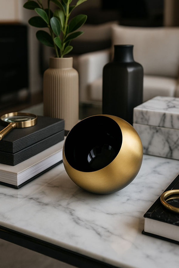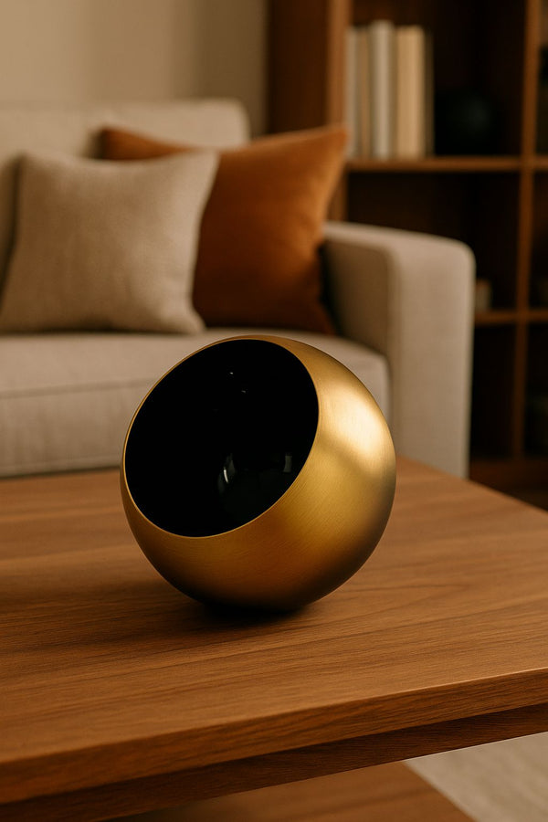 A Orbe Doré é uma escultura decorativa de presença magnética, feita inteiramente em metal, com acabamento externo em dourado acetinado e interior em preto profundo. Medindo 17x17 cm, seu formato esférico com abertura inclinada cria uma composição visual de alto contraste e elegância.