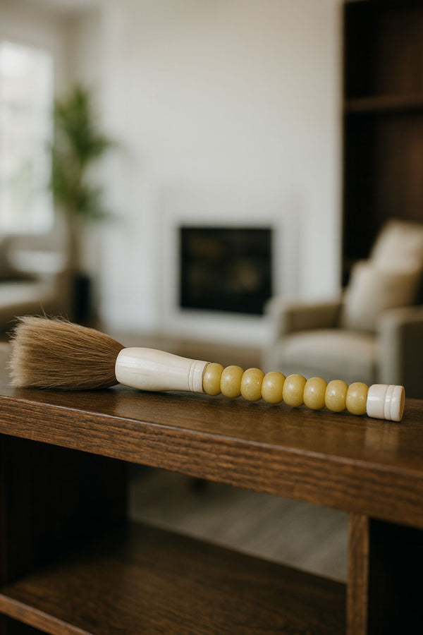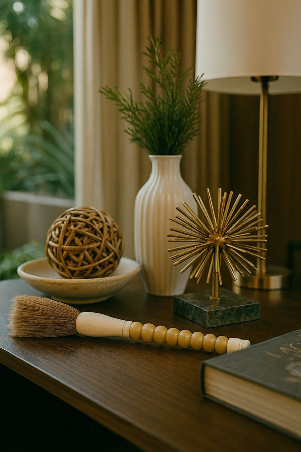 O Pincel Decorativo Aurora é uma peça de elegância artesanal que transcende sua função utilitária para se tornar um elemento de estilo em ambientes sofisticados. Com cabo em madeira torneada de acabamento suave e esferas que adicionam movimento visual, combina-se ao toque macio das cerdas naturais, criando um equilíbrio entre rusticidade e delicadeza. Suas proporções de 33 × 3 cm permitem que seja disposto em aparadores, mesas laterais ou estantes, compondo harmoniosamente ao lado de vasos, caixas e livros decorativos. Um detalhe de personalidade que enriquece a ambientação e traduz bom gosto em cada espaço.