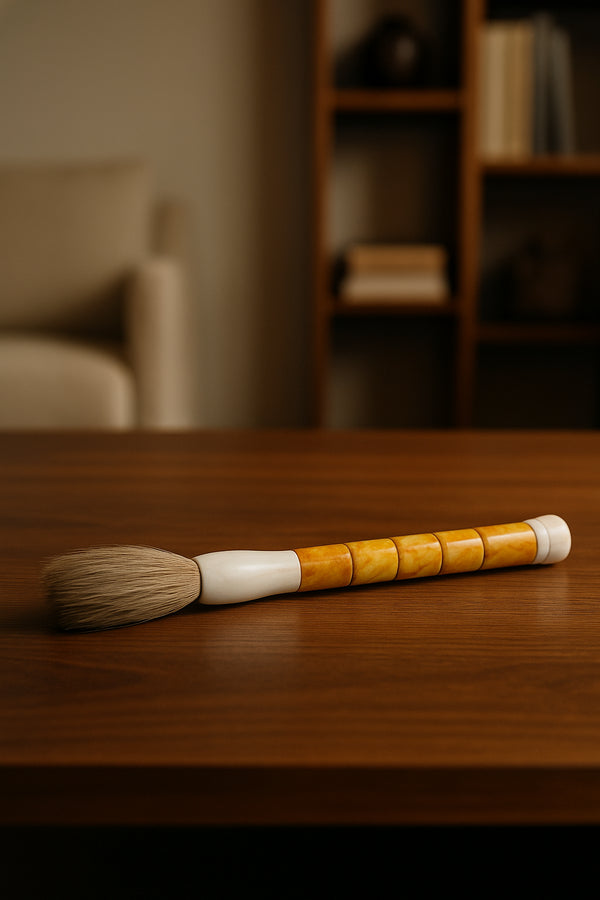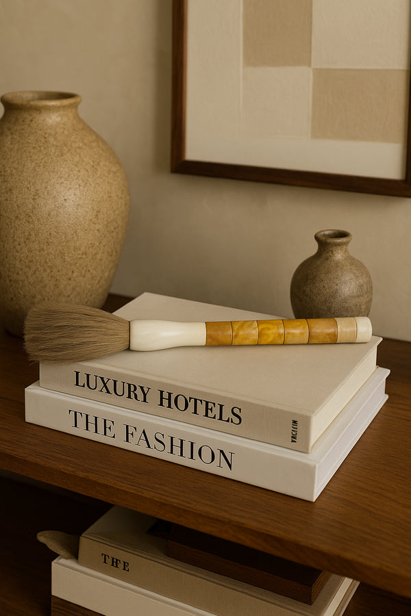 Com 32 cm de puro refinamento, o Pincel Décor Mistral d’Ambre é mais do que um adorno — é uma peça de expressão artística e personalidade. Seu cabo trabalhado em segmentos de resina marmorizada âmbar, com nuances douradas e textura visual que remete ao mármore polido, contrasta elegantemente com as extremidades em tom marfim liso e suave.
