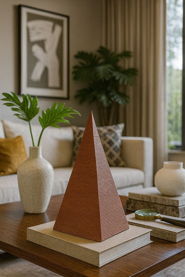 A Pirâmide Terracotta é uma peça de presença marcante, que une linhas geométricas minimalistas a um acabamento sofisticado em terracota. Com 13 × 28 cm, sua forma alongada transmite imponência e elegância, transformando qualquer ambiente em uma composição de destaque. Ideal para adornar aparadores, mesas de centro ou estantes decoradas, esta escultura traz equilíbrio entre modernidade e atemporalidade, harmonizando-se facilmente com outros elementos decorativos como vasos, caixas e livros. Um verdadeiro símbolo de força e sofisticação para a sua coleção de interiores.