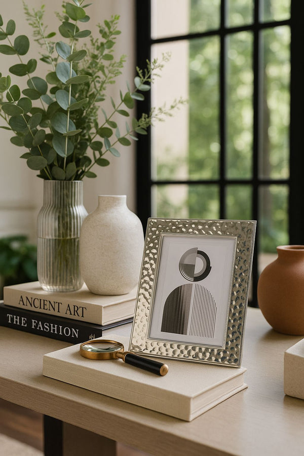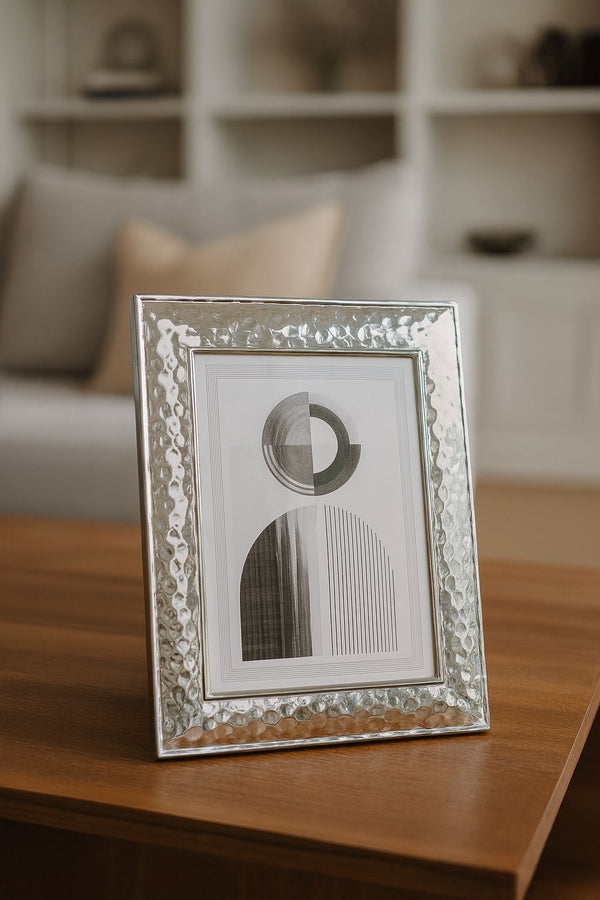 O Porta-Retrato Chroma é uma peça de design refinado que combina brilho e textura em perfeita harmonia. Sua moldura em metal prateado com acabamento martelado reflete a luz com sutileza, criando um efeito visual sofisticado que valoriza qualquer ambiente. Ideal para adornar aparadores, estantes ou mesas de escritório, o Chroma transforma lembranças em elementos de decoração atemporais. Uma peça que exala elegância e modernidade em cada detalhe. Dimensões: 23,5 × 18,5 cm.