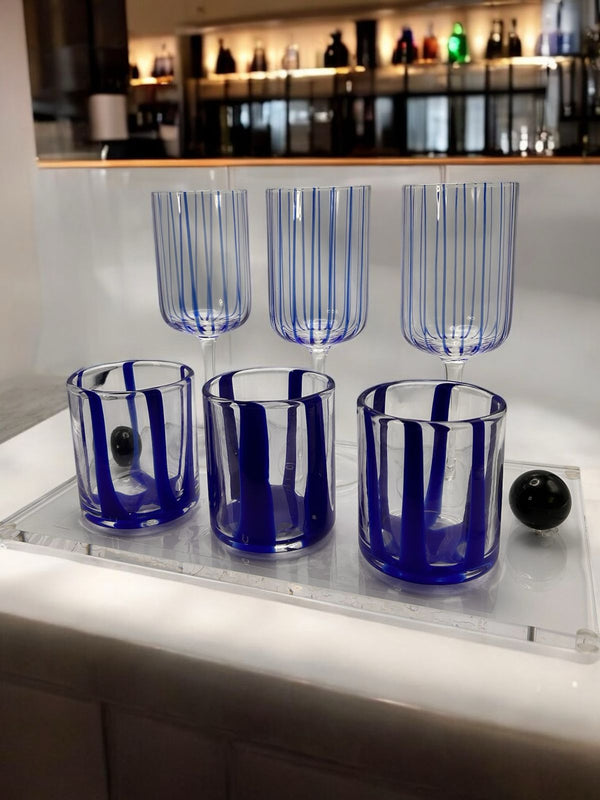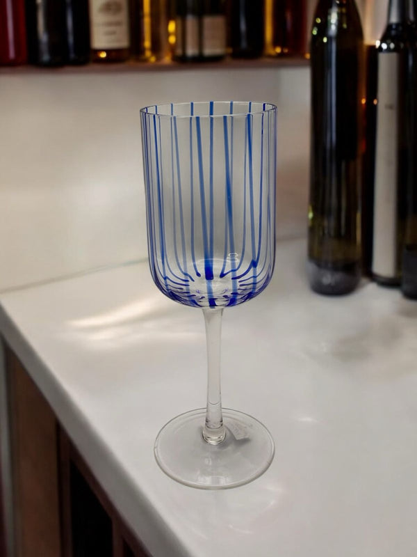 Eleve sua experiência ao degustar vinhos e drinks com a Taça Eclipse Azul. Seu design refinado, com linhas azuis verticais sobre vidro transparente, cria um efeito visual elegante e moderno, tornando cada gole ainda mais especial.