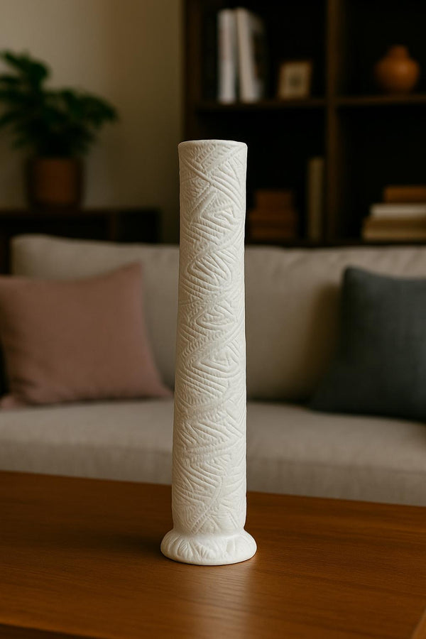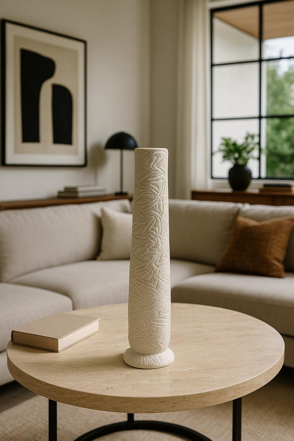Com 45 cm de altura, o Tramato Bianco é mais do que um vaso decorativo — é uma escultura contemporânea que eleva a atmosfera de qualquer ambiente. Suas linhas esculpidas em alto-relevo e o acabamento fosco em tom marfim conferem uma elegância silenciosa e sofisticada.