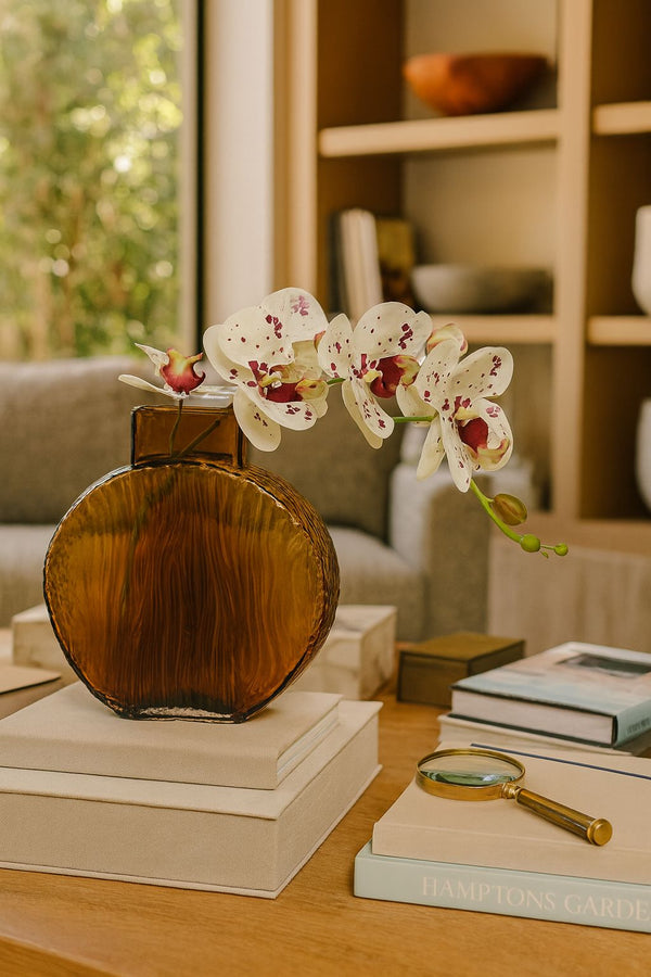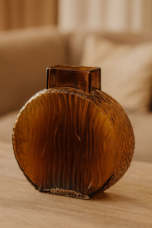 O Vaso Arden combina simplicidade elegante com um design de presença marcante. Seu vidro texturizado em tom âmbar cria um jogo de luz acolhedor, destacando as nuances naturais da peça. Com formato orgânico e proporções equilibradas, ele funciona tanto como suporte para arranjos delicados quanto como peça escultural independente. Um objeto de decoração que transmite sofisticação discreta e eleva instantaneamente qualquer composição.