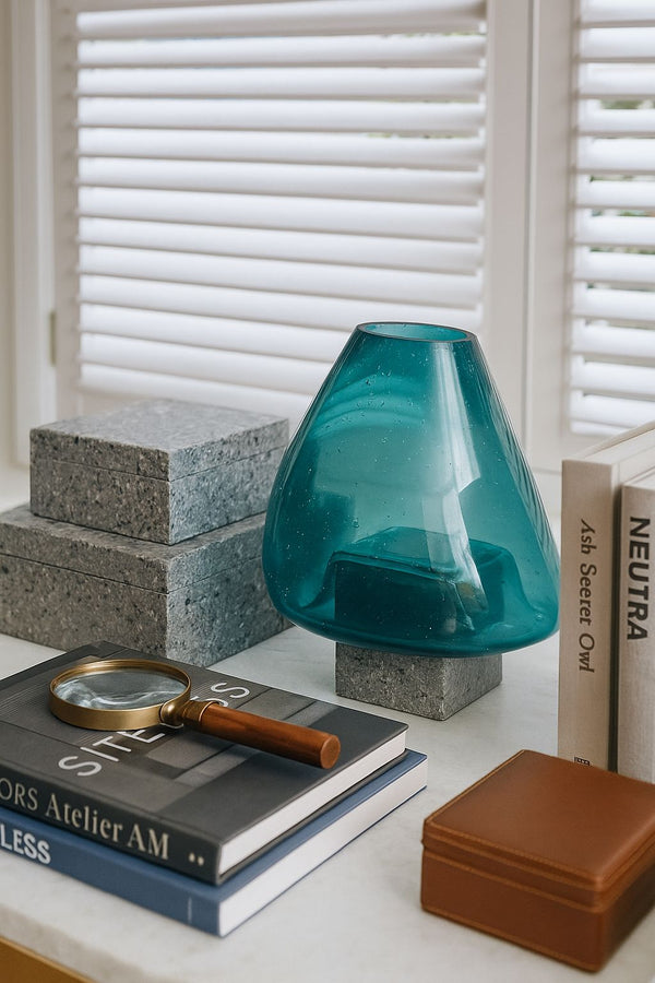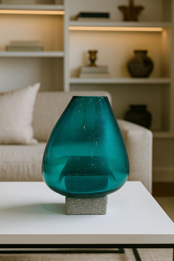 O Vaso Belami nasce da fusão entre design orgânico e sofisticação contemporânea. Seu vidro em tom turquesa profundo apresenta pequenas bolhas naturais suspensas na transparência, como se fossem fragmentos de ar capturados no instante da criação — um detalhe que reforça seu caráter artesanal e exclusivo.