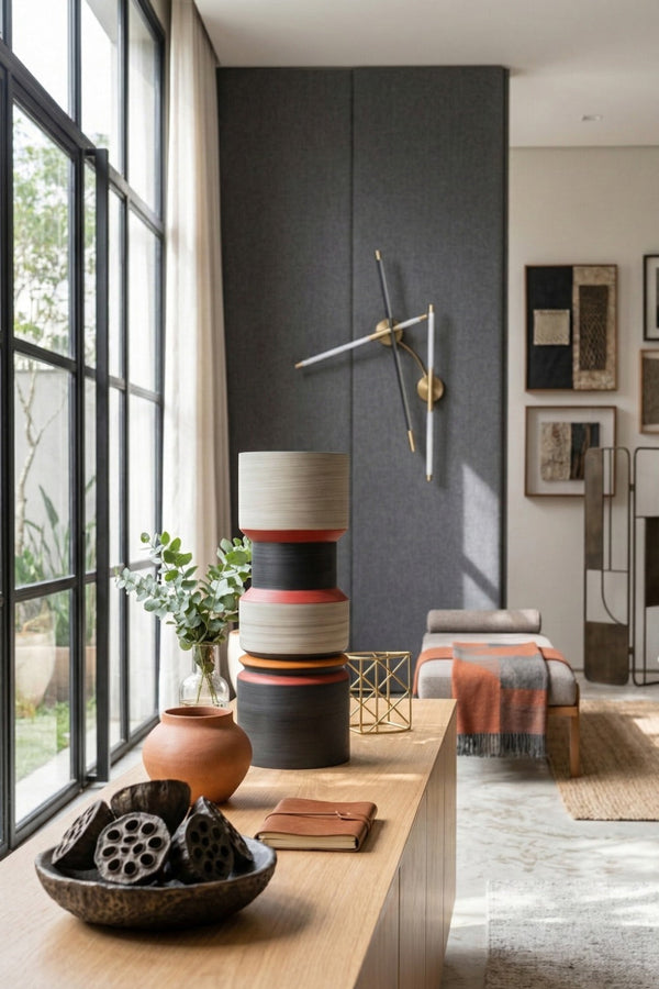 O Vaso Trama Orbitale traduz a linguagem do design contemporâneo por meio de formas empilhadas que criam um jogo visual de equilíbrio e contraste. As diferentes tonalidades e texturas percorrem a peça como camadas escultóricas, formando uma composição moderna e expressiva.