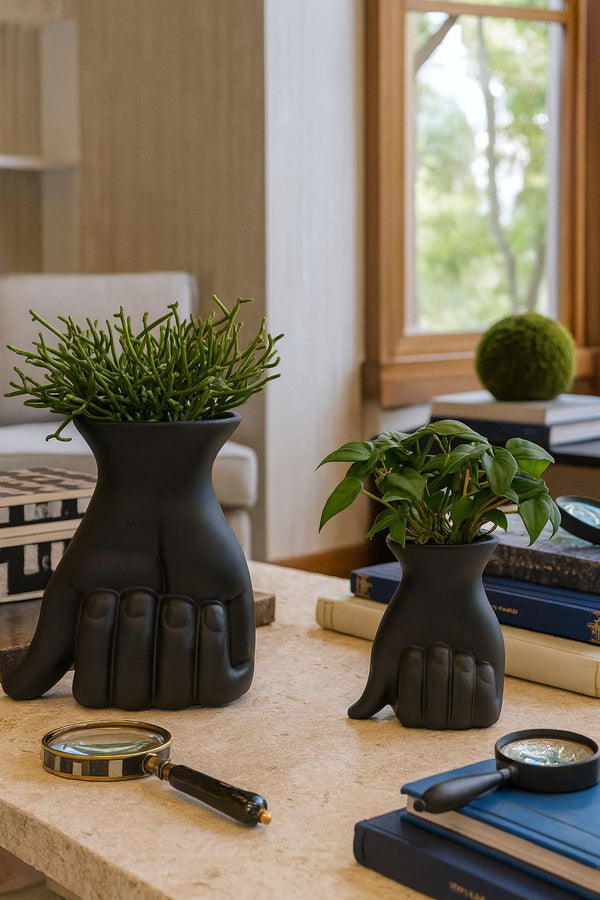 Os Vasos Grip traduzem a união entre design contemporâneo e expressão artística. Com acabamento em preto fosco e formato que remete à força de uma mão em gesto firme, essas peças transmitem personalidade e presença em qualquer composição decorativa. Seu design marcante adiciona intensidade visual sem perder a sofisticação, tornando-os ideais para realçar plantas, folhagens ou simplesmente brilhar como esculturas independentes. Disponíveis em dois tamanhos — 21x17cm e 15x11cm —, são a escolha perfeita para quem busca exclusividade e impacto estético na decoração.