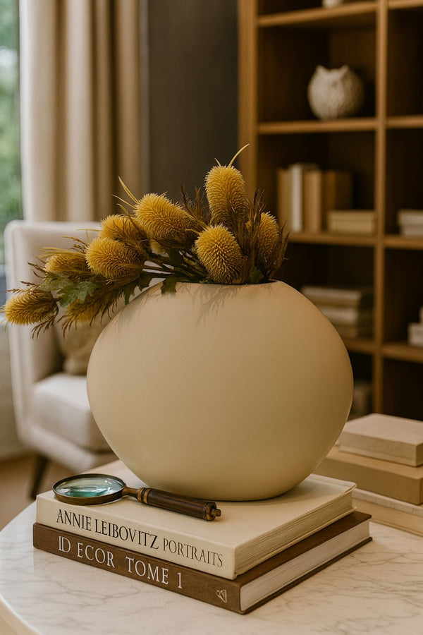 Com medidas de 32x35cm, o Vaso Luna pode ser explorado de múltiplas formas: valorizando arranjos de flores secas, naturais ou folhagens exuberantes, ou mesmo como peça solitária, impondo-se como escultura decorativa.