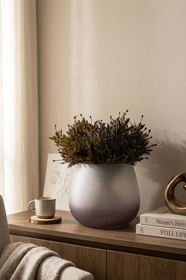 O vaso Nebulosa se destaca pela sua estética envolvente e pela fluidez de suas formas. O acabamento fosco aliado ao degradê cria um efeito visual profundo e sofisticado, capaz de transformar a percepção do ambiente.