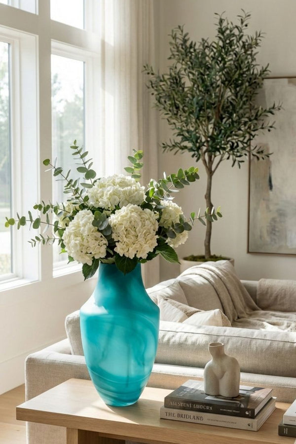Com proporções imponentes de 41 cm de altura, 20 cm de comprimento e 20 cm de largura, ele foi pensado para ser o ponto focal perfeito em aparadores, mesas de centro, estantes ou halls de entrada. Extremamente versátil, o Vaso Oceano brilha de forma absoluta como uma escultura decorativa solitária, mas também ganha vida e ainda mais destaque quando composto com arranjos florais ou folhagens. É a escolha ideal para clientes que buscam requinte, personalidade e design contemporâneo em cada detalhe de casa.