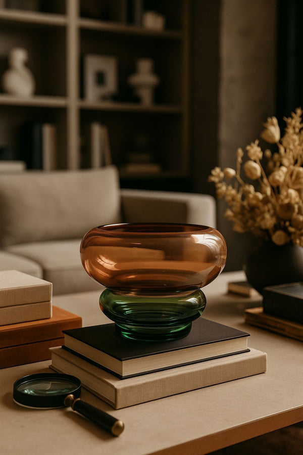 O Vaso Smeraldo é uma peça de design contemporâneo que combina a profundidade do verde-esmeralda com o brilho âmbar em um vidro de acabamento translúcido e acabamento artesanal. Sua silhueta orgânica e escultural cria um jogo de luz e reflexos que valoriza tanto composições minimalistas quanto arranjos decorativos mais elaborados.