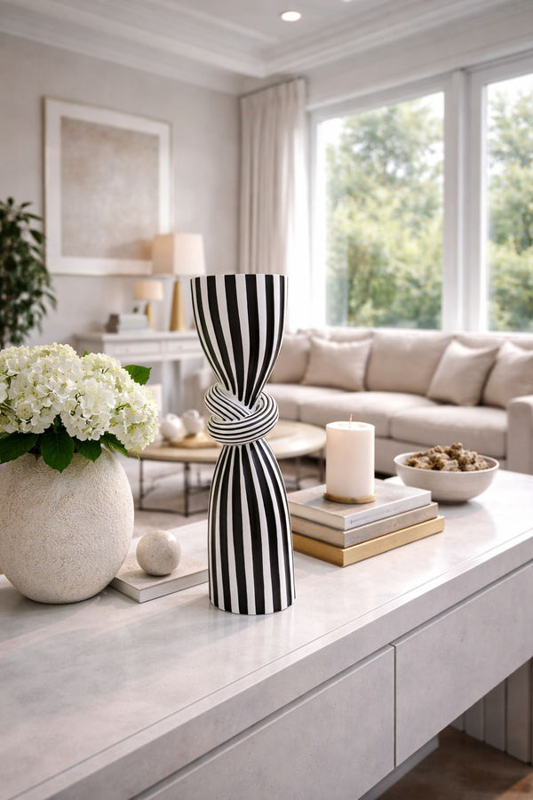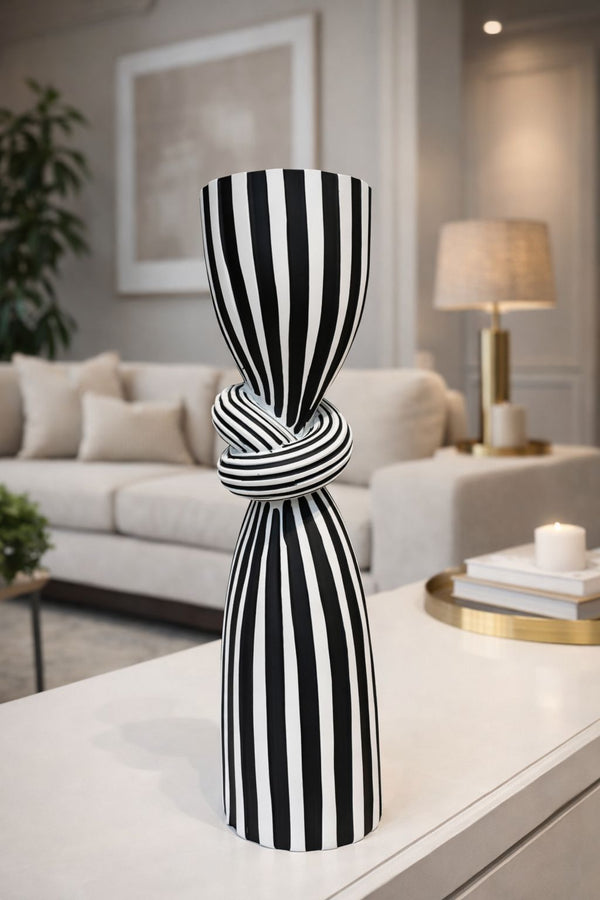 As listras verticais acentuam sua elegância e criam um efeito visual hipnotizante, destacando a peça em qualquer composição decorativa. Com dimensões de 39 cm de altura e 10 cm de diâmetro, é perfeito para compor cenários sofisticados, seja isoladamente como peça protagonista ou em composições cuidadosamente elaboradas.