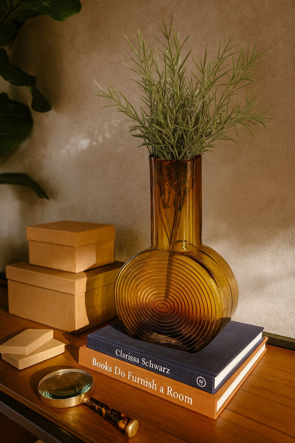 O Vaso Circus é uma peça de personalidade marcante, concebida para transformar qualquer composição decorativa em um espetáculo visual. Suas linhas circulares em relevo criam um movimento hipnótico que remete à fluidez e ao dinamismo de formas modernistas, enquanto o tom âmbar acrescenta calor, profundidade e um toque artístico ao ambiente.