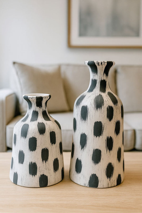 O Vaso Cow apresenta um estilo contemporâneo que une suavidade orgânica e um toque artístico marcante. Seu acabamento em cerâmica, com manchas pinceladas em preto sobre fundo claro, cria um visual moderno e cheio de personalidade, perfeito para composições decorativas que buscam impacto visual com elegância.