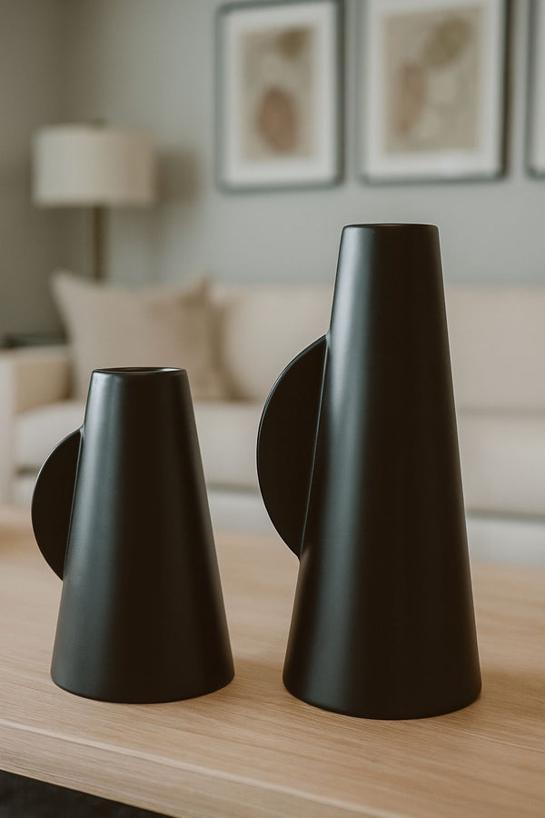 Com estética marcante e aura contemporânea, os Vasos Cuervo impressionam pelo equilíbrio entre força e sofisticação. Seu acabamento em cerâmica fosca evidencia o tom profundo e elegante do preto, enquanto suas curvas geométricas conferem personalidade e presença ao ambiente.