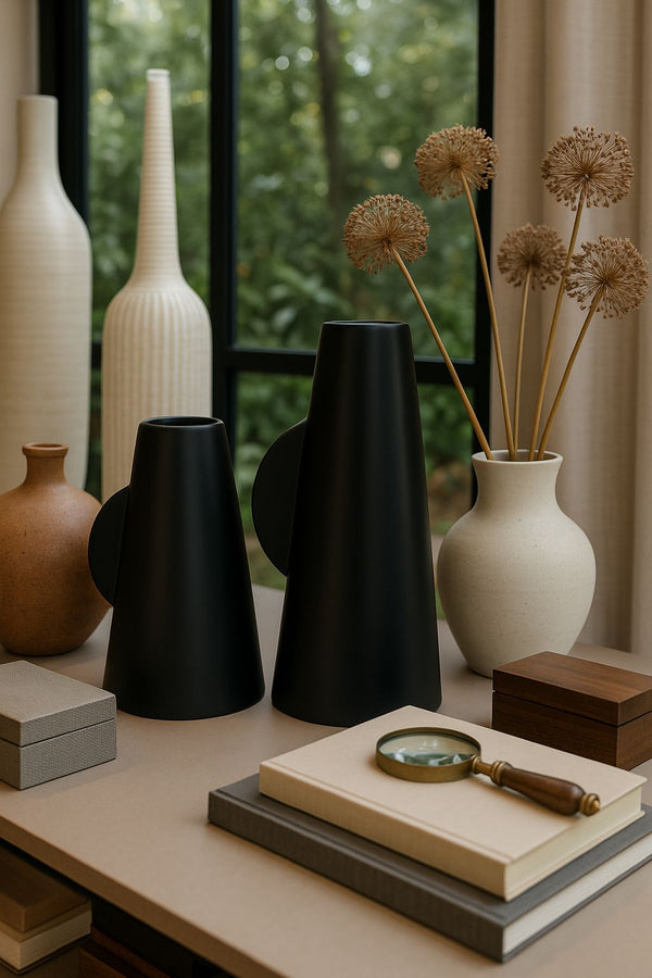 Ideais para composições em aparadores, mesas de centro ou estantes, os Vasos Cuervo dialogam perfeitamente com materiais nobres como madeira, mármore e metal, criando contrastes refinados e visuais de alto impacto.
