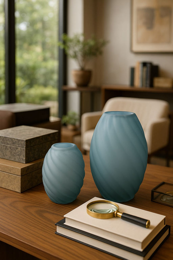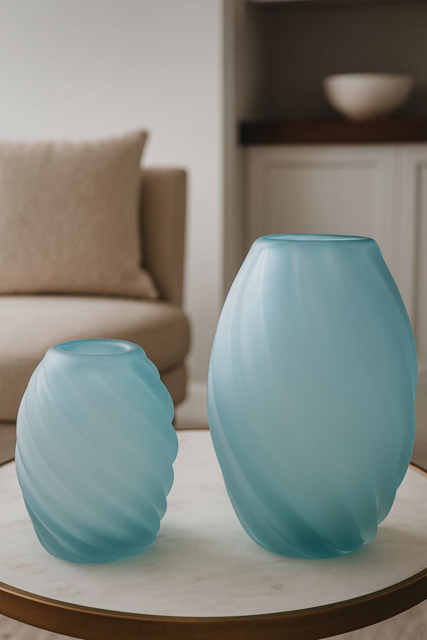 Fabricados em vidro fosco de alta qualidade, exibem um tom azul suave que se integra com elegância a ambientes modernos e sofisticados. Perfeitos para adornar mesas de centro, aparadores ou estantes, trazem um toque de leveza artística e refinamento atemporal à composição.