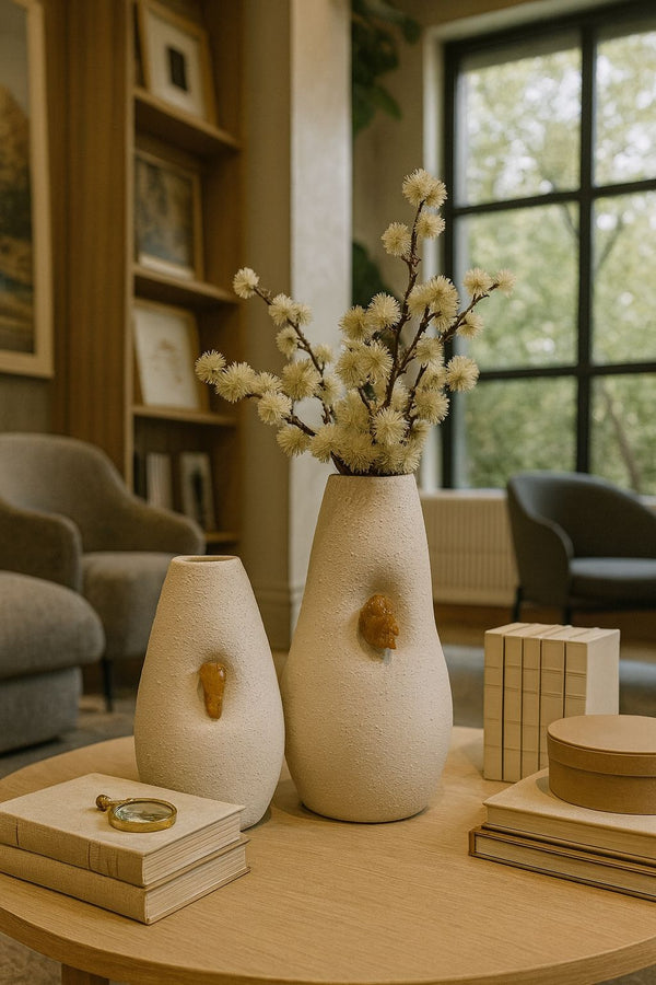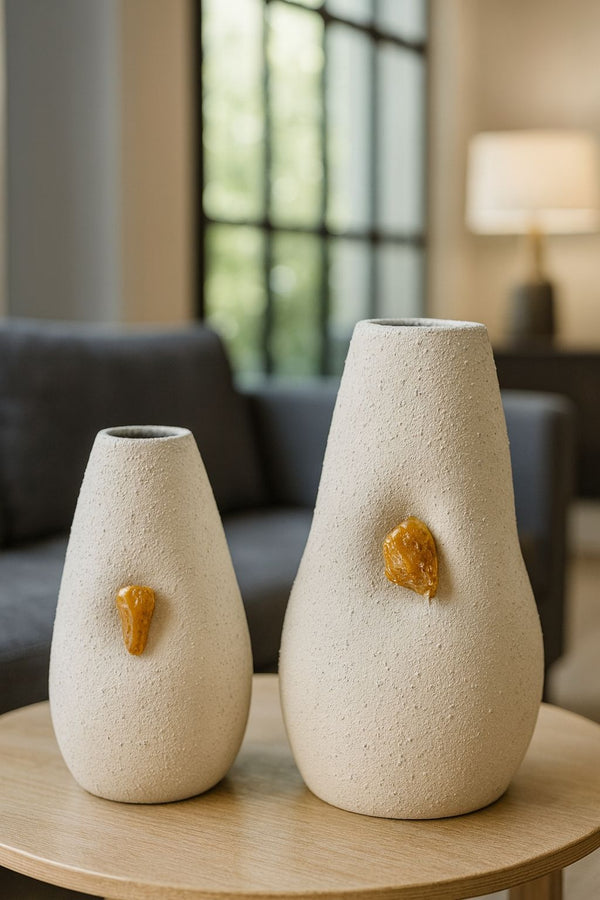 Os Vasos Petra representam a força da estética mineral traduzida em formas contemporâneas. Moldados em cerâmica de textura granulada, exibem um acabamento que remete à rocha bruta suavizada pelo tempo, enquanto a pedra âmbar inserida na superfície acrescenta um ponto de luz natural e orgânico.