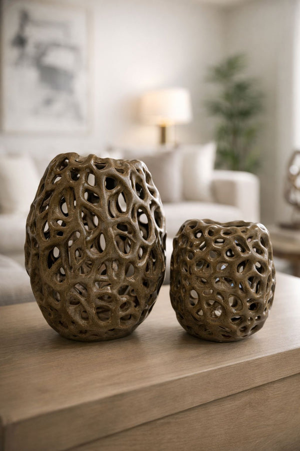 Com uma estética escultural que remete às formas orgânicas da natureza, os Vasos Reticolo Terra traduzem a beleza do imperfeito com uma elegância singular. Sua estrutura vazada, cuidadosamente desenhada em tramas fluidas, cria jogos de luz e sombra que enriquecem qualquer ambiente com profundidade e sofisticação.
