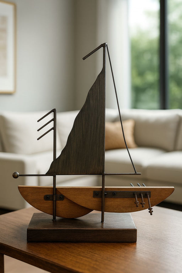 A escultura Veleiro Bravura traduz a elegância e o espírito aventureiro das grandes navegações em uma peça de design contemporâneo. Confeccionada em madeira natural e estrutura metálica de linhas minimalistas, sua vela assimétrica e detalhes náuticos revelam um estilo sofisticado e atemporal. Com dimensões de 34 × 32,5 cm, esta obra é perfeita para enriquecer estantes, aparadores ou mesas laterais, adicionando um toque de movimento e personalidade ao ambiente. Ideal para composições decorativas com livros, vasos e outros objetos, oferece um charme discreto que evoca liberdade e bom gosto.